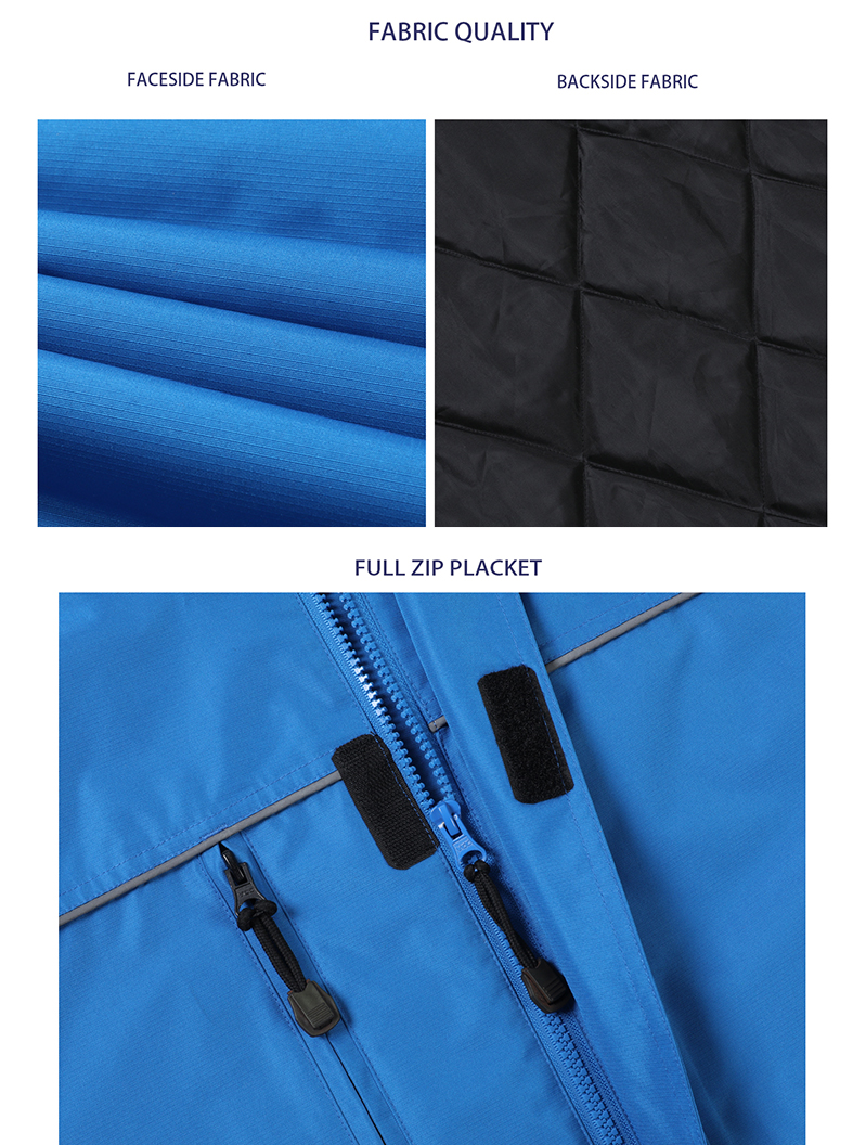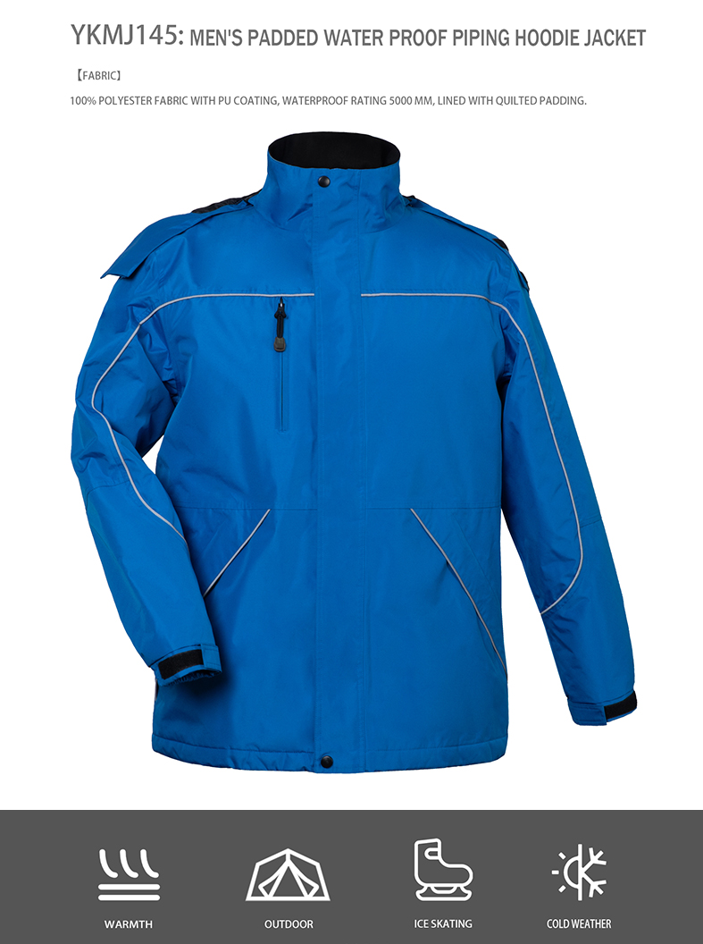 【FABRIC】100% polyester fabric with Pu coating, waterproof rating 5000 mm, lined with quilted padding.