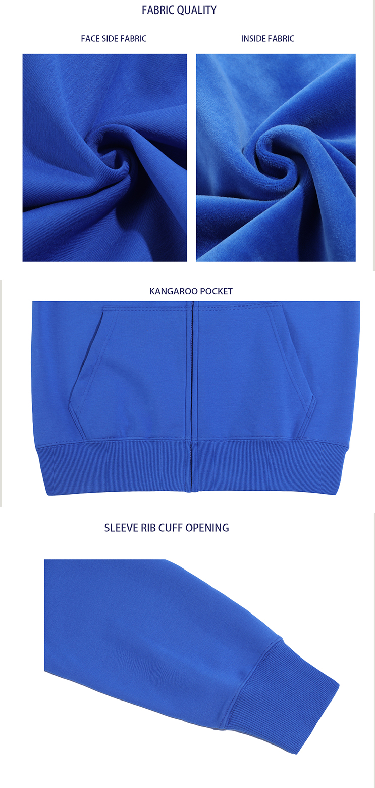 【FEATURES】full open zips on front with classic zip puller; 2 side pockets; 2x2 rib on both sleeve cuff and hem